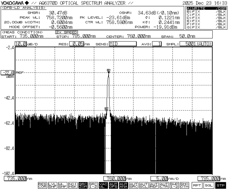 | Središčna valovna dolžina | λc | TL=25 ℃ CW | 758 | 760 | 762 | nm |