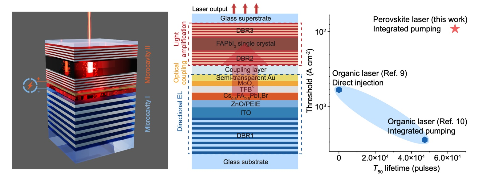Naprava naj bi učinkovito združila veliko število fotonov, ki jih generira perovskitna LED z električno vzbujeno mikrovotlino, v drugo mikrovotlino. Tam jih vzbuja enokristalni perovskitni pridobitveni medij, ki ustvarja lasersko sevanje z učinkovitostjo sklopitve kar 82,7 %. Začetni tok, ki je potreben za sprožitev tega novega polprevodniškega laserja, je 92 amperov na kvadratni centimeter, kar je za velikostni red višje kot pri najboljših električno gnanih organskih laserjih, in kaže odlično stabilnost.